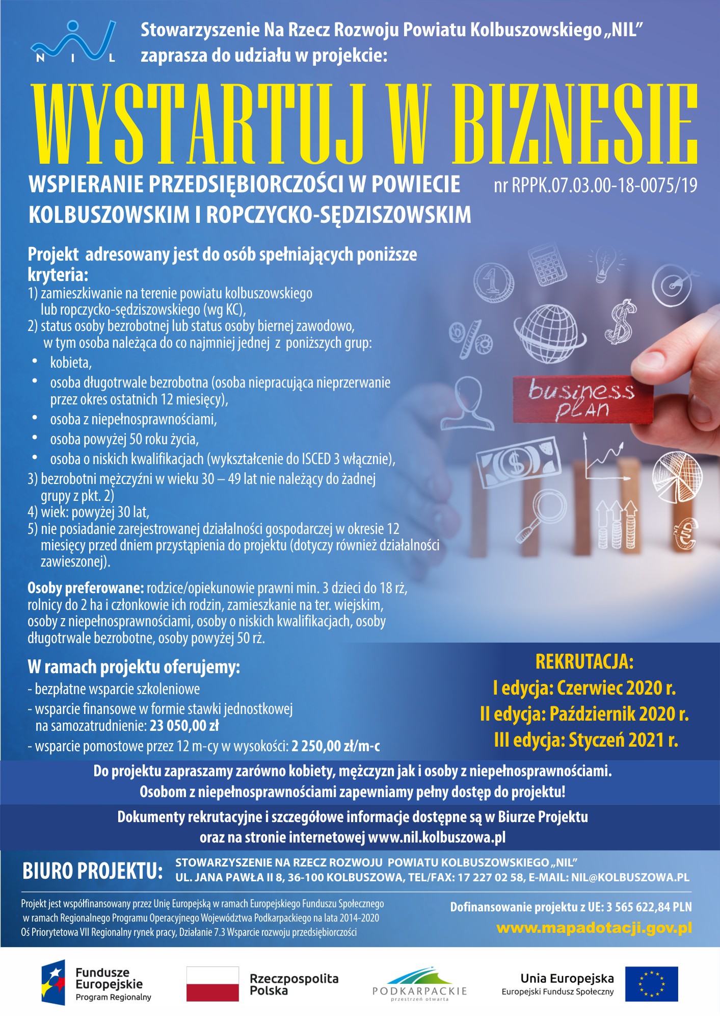 Stowarzyszenie Na Rzecz Rozwoju Powiatu Kolbuszowskiego "NIL" informuje o rozpoczęciu przyjmowania Wniosków o przyznanie wsparcia finansowego i pomostowego wraz z biznesplanem i wymaganymi załącznikami dla II grupy Uczestników/Uczestniczek Projektu „Wystartuj w biznesie - wspieranie przedsiebiorczości w powiecie kolbuszowskim i ropczycko - sędziszowskim" realizowanego w ramach działania 7.3 Wsparcie rozwoju przedsiębiorczości, Priorytet VII Regionalny rynek pracy, Regionalnego Programu Operacyjnego Województwa Podkarpackiego na lata 2014-2020.